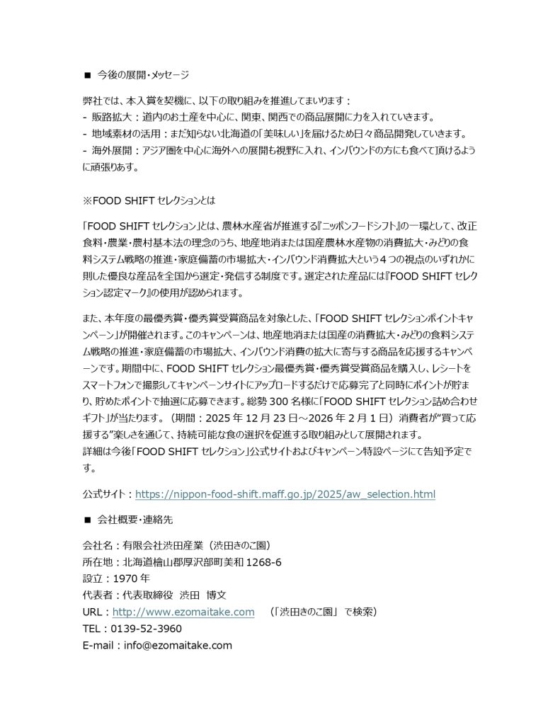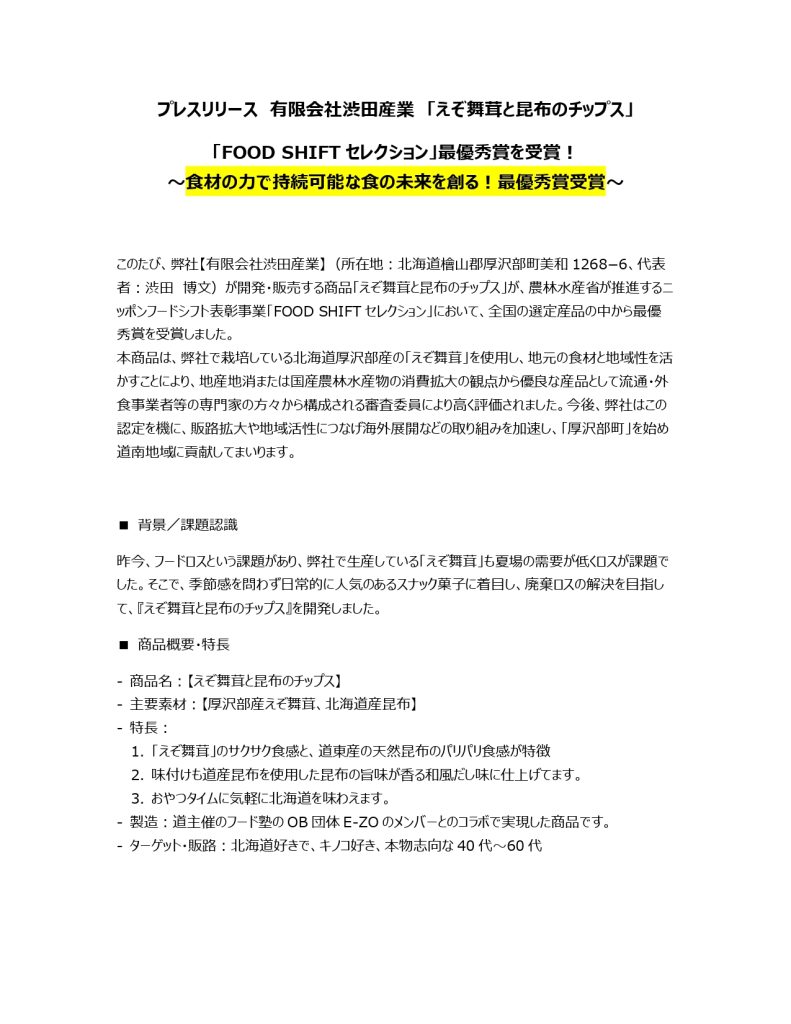 プレスリリース「えぞ舞茸と昆布のチップス」 「FOOD SHIFTセレクション」最優秀賞を受賞しました! 2025.11.16 プレスリリース 有限会社渋田産業 「えぞ舞茸と昆布のチップス」 「FOOD SHIFTセレクション」最優秀賞を受賞!しました Tweet Share